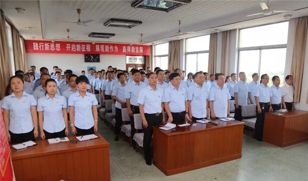 當(dāng)天的五樓會議室裝扮地莊嚴(yán)肅穆,中國共產(chǎn)黨黨徽懸掛在主席臺正中央,在鮮艷的紅旗簇?fù)硐拢陟谏x。上午九點,會議在嘹亮的《國歌》聲中開始。